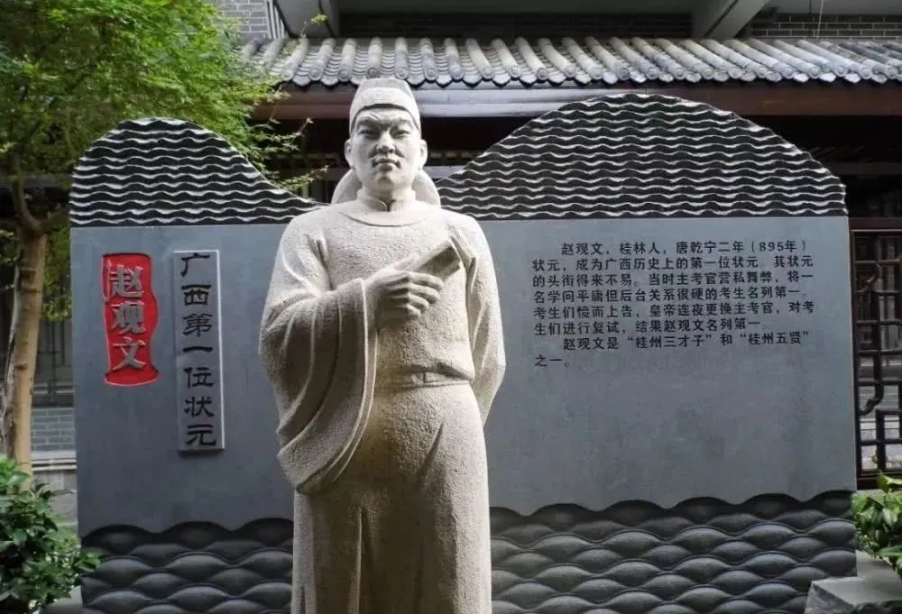 唐昭宗乾寧二年(895),這時歷史已經(jīng)進入到唐末,貞觀之治的欣欣向榮與開元盛世的繁華奢靡已成為遙遠的夢幻。安史之亂帶來的宦官專權(quán),外蕃割據(jù)的混亂局面到此時達到了頂峰,生于斯、長于斯的趙觀文滿腹的詩書經(jīng)綸,滿腔的報國熱情終將成為明日黃花,最后激流勇退,老守田園。然而他的狀元功名的取得卻激勵了更多的廣西學子,帶動了廣西文化的發(fā)展;他清廉不阿的品德,被后人所敬仰,并成為廣西官員學習和效仿的典范。他去世后,人們建“五賢祠”來紀念他,將他與同時代的桂林陽朔詩人曹鄴、臨桂詩人曹唐并稱為“桂州三才子”。